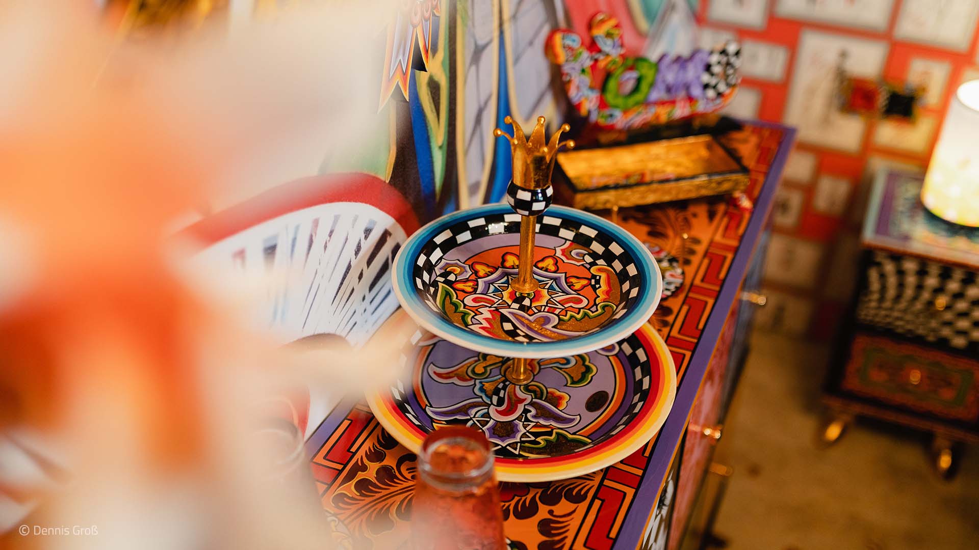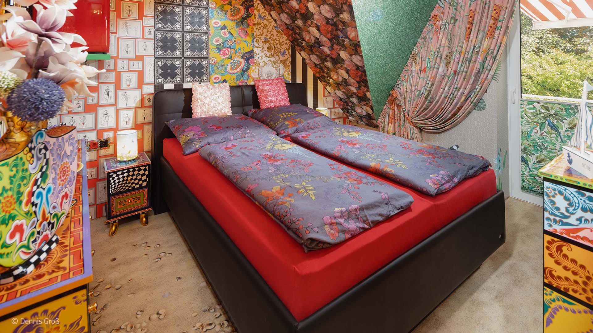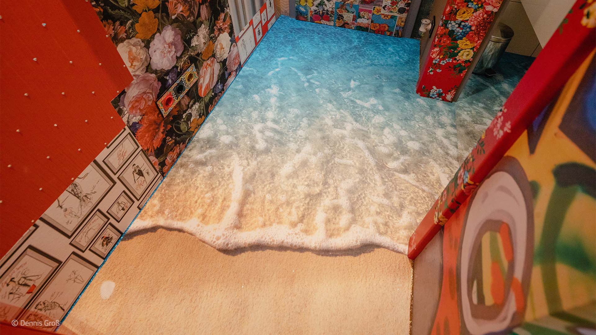 Wir haben Nickv Fischer im vergangenen Herbst im Zusammenhang mit einem Redaktionsbeitrag über ein von ihr kreiertes Küchendesign kennengelernt. Dabei hat sie uns eingeladen, sie an ihren Standorten auf Norderney und im Norden zu besuchen. Was wir dort gesehen haben, ist mit Worten schwer zu beschreiben. Die überbordende visuelle Eindringlichkeit bleibt im Rahmen der eigenen Erfahrungen bestenfalls annähernd vergleichbar mit dem Wohnhaus des spanischen Surrealisten Salvador Dalí in Portlligat bei Cadaqués. Wie der katalanische Künstler schert sich Nicky Fischer wenig um den Mainstream ästhetischer Konventionen. Doch jede von ihr gestaltete Umgebung löst etwas aus. Kalt lässt Nickys Design niemand. Das Selbstbewusstsein und die Dynamik liegen in der Familie. Die Kapitänstochter aus Bremen hat schon als Jugendliche mit ihrem Vater auf großer Fahrt die Weltmeere bereist. Sie ist die Großnichte 2. Grades der Pilotenlegende Manfred von Richthofen, dem „Roten Baron“ der als waghalsiger Kampfflieger während des Ersten Weltkriegs viele seiner Maschinen rot lackieren ließ. „Das habe ich mit ihm gemeinsam – auch mich begleitet die Farbe Rot schon mein ganzes Leben lang.“