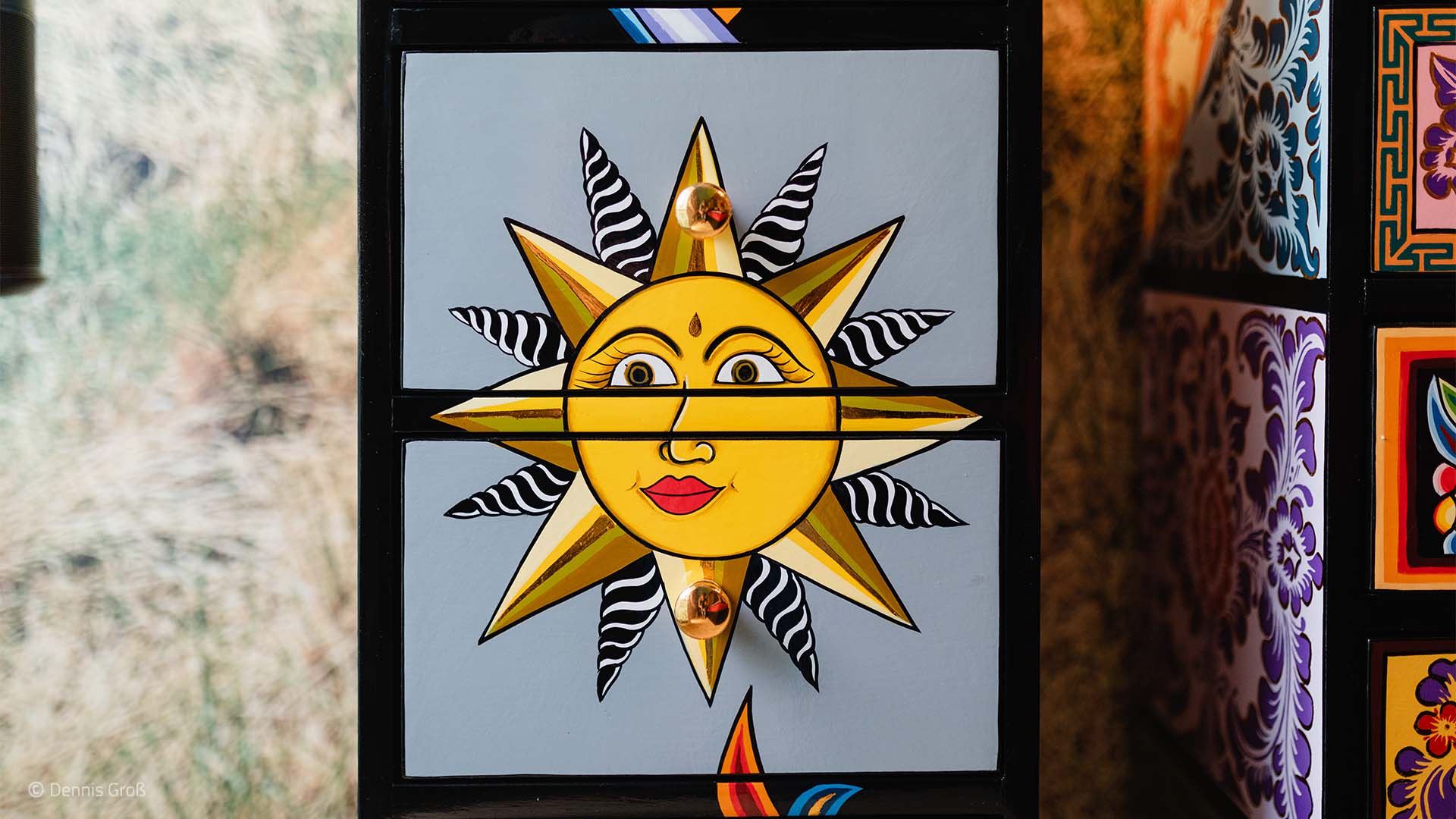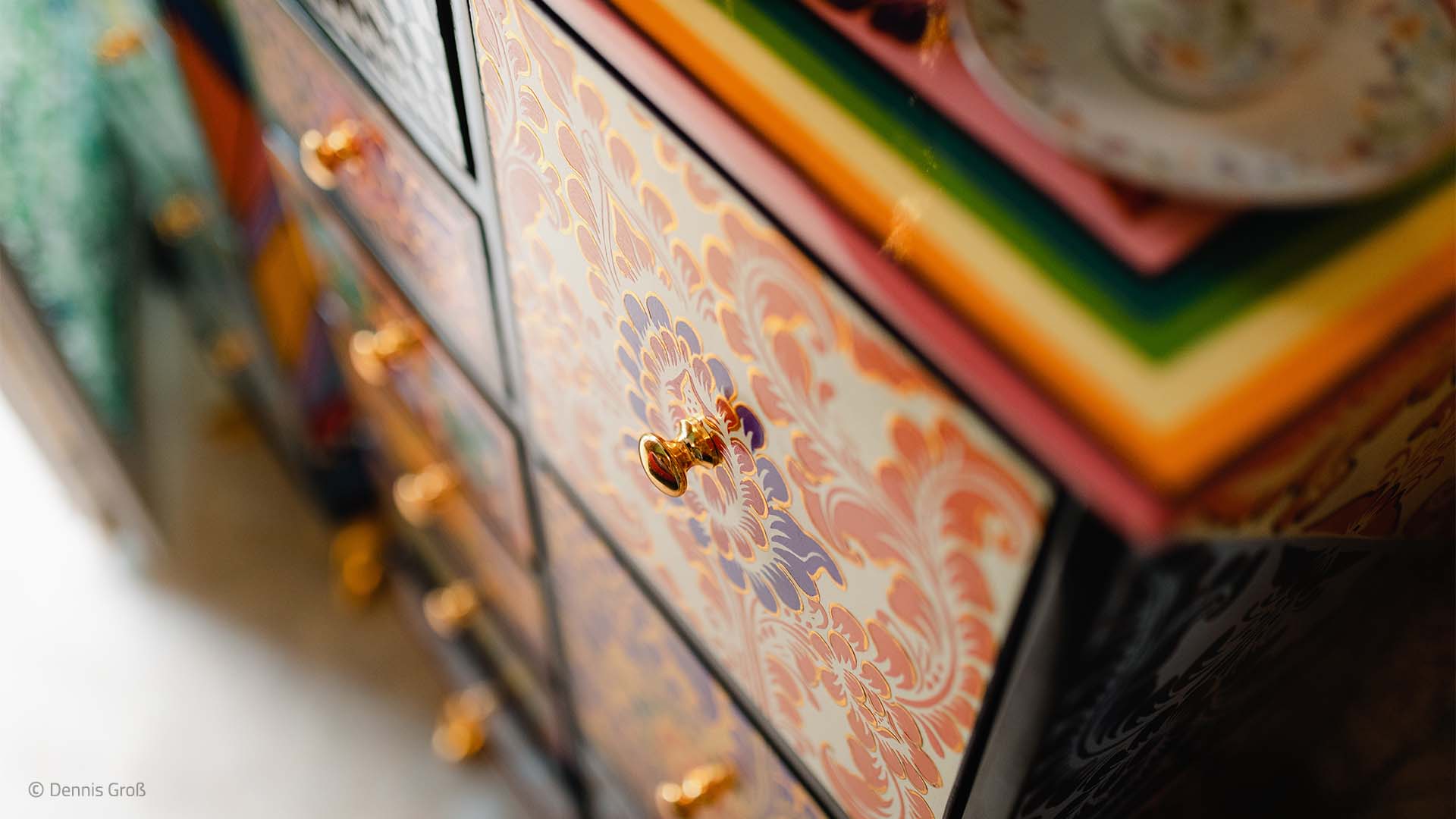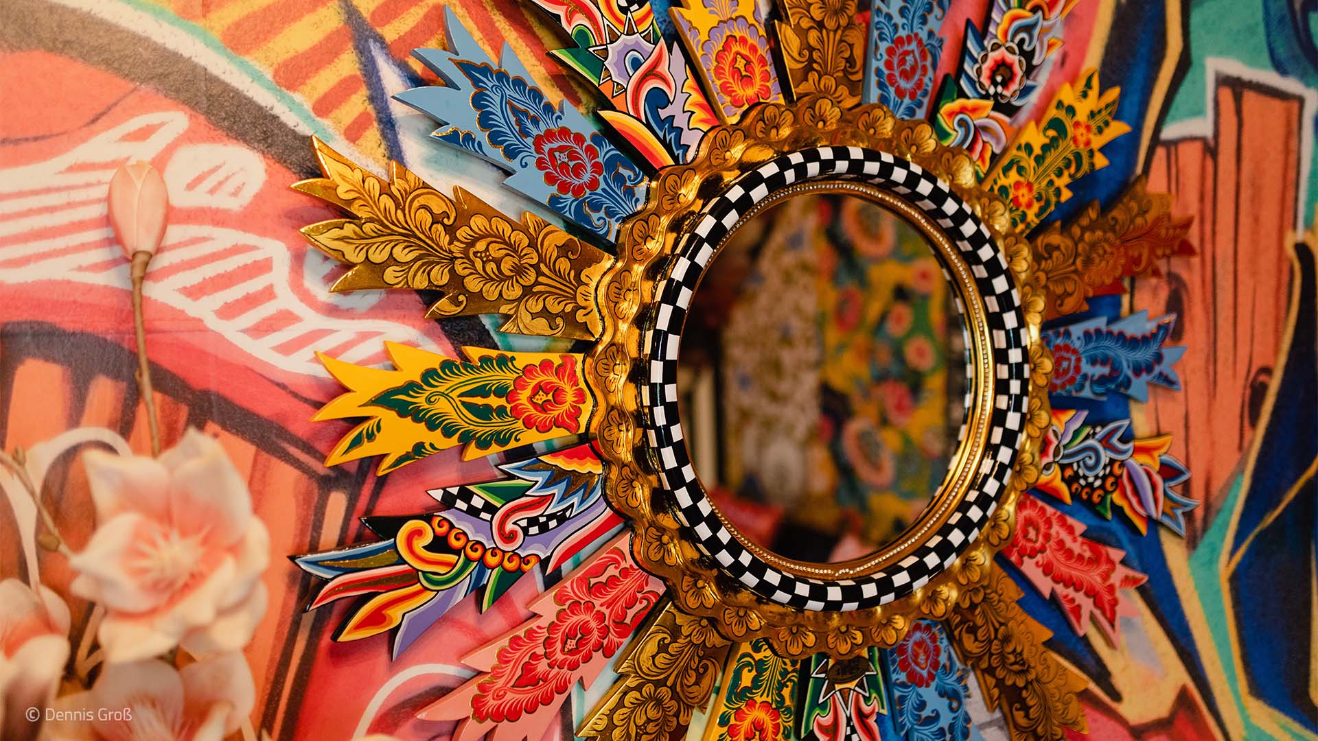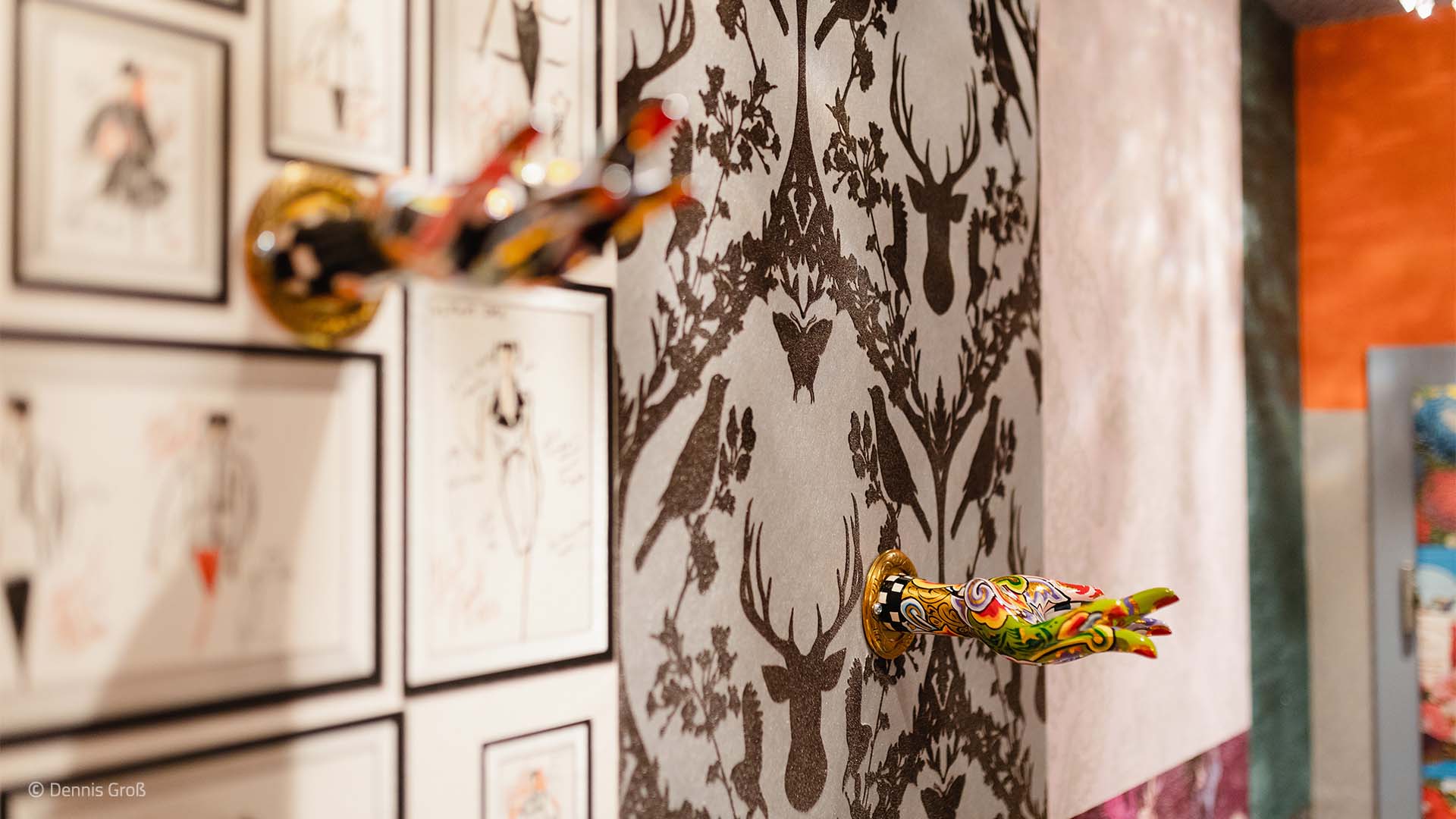 Wir haben Nickv Fischer im vergangenen Herbst im Zusammenhang mit einem Redaktionsbeitrag über ein von ihr kreiertes Küchendesign kennengelernt. Dabei hat sie uns eingeladen, sie an ihren Standorten auf Norderney und im Norden zu besuchen. Was wir dort gesehen haben, ist mit Worten schwer zu beschreiben. Die überbordende visuelle Eindringlichkeit bleibt im Rahmen der eigenen Erfahrungen bestenfalls annähernd vergleichbar mit dem Wohnhaus des spanischen Surrealisten Salvador Dalí in Portlligat bei Cadaqués. Wie der katalanische Künstler schert sich Nicky Fischer wenig um den Mainstream ästhetischer Konventionen. Doch jede von ihr gestaltete Umgebung löst etwas aus. Kalt lässt Nickys Design niemand. Das Selbstbewusstsein und die Dynamik liegen in der Familie. Die Kapitänstochter aus Bremen hat schon als Jugendliche mit ihrem Vater auf großer Fahrt die Weltmeere bereist. Sie ist die Großnichte 2. Grades der Pilotenlegende Manfred von Richthofen, dem „Roten Baron“ der als waghalsiger Kampfflieger während des Ersten Weltkriegs viele seiner Maschinen rot lackieren ließ. „Das habe ich mit ihm gemeinsam – auch mich begleitet die Farbe Rot schon mein ganzes Leben lang.“