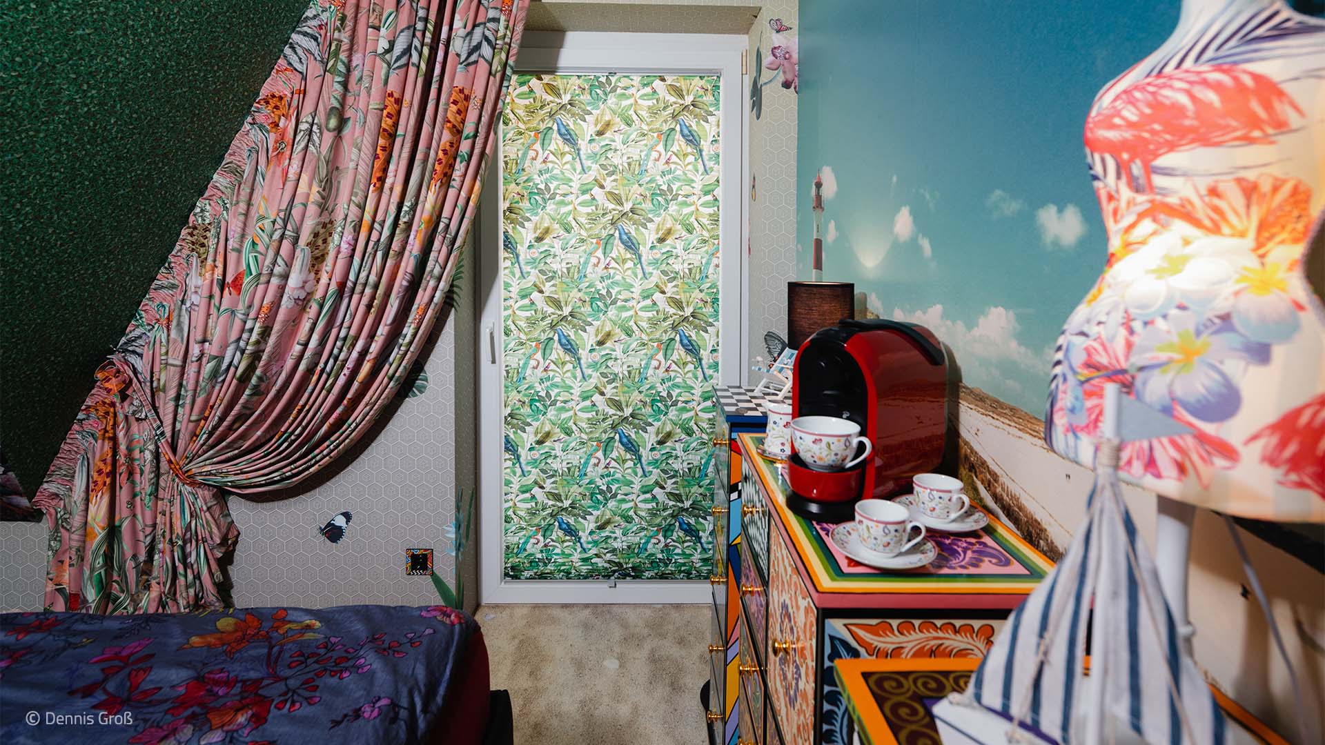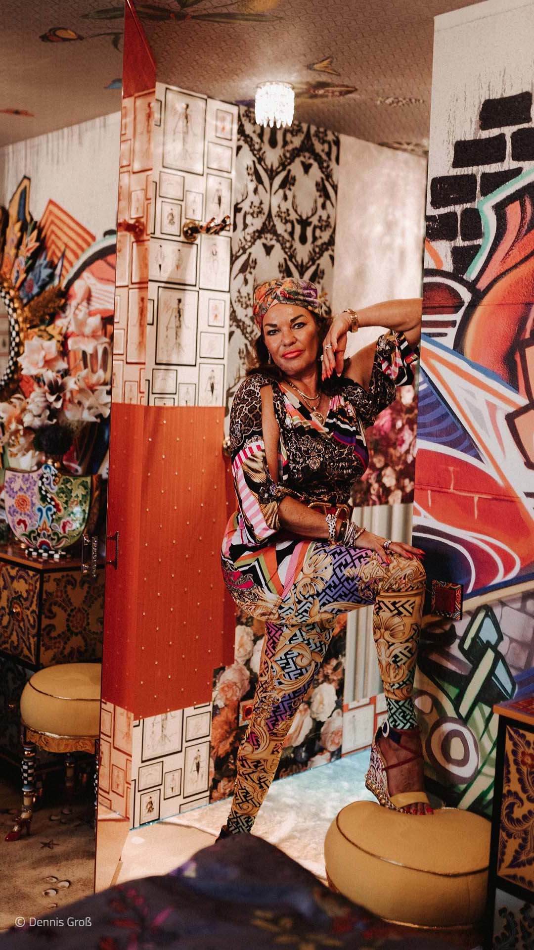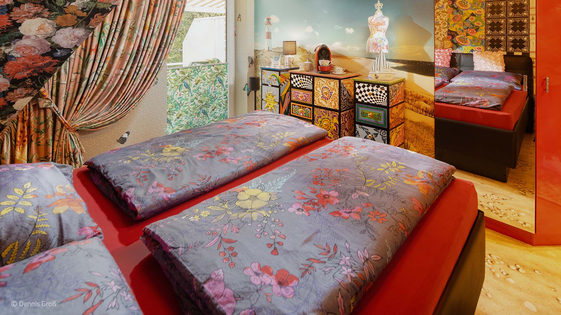 Fotos und Beschreibungen können das Erlebnis, sich in einer von Nicky Fischer gestalteten Umgebung aufzuhalten, nur ausschnitthaft wiedergeben. Am besten, man sieht es mit eigenen Augen. Wie eingangs erwähnt, hat Nicky zur Saison 2022 an ihrem Standort auf Norderney mit dem für sie typischen Interieur ein außergewöhnliches Ferienquartier eingerichtet – ein exklusives Designerzimmer mit Balkon und en Suite Bad, in dem man den Nicky-Style rund um die Uhr mit allen Sinnen erfahren kann. Das im Herzen der Insel – unweit vom Kurplatz – am Rosengarten gelegene „Nicky’s Lifestyle Apartment“ bietet Raum für ein oder zwei Personen und eine Ausstattung, die ihresgleichen sucht. Vom mit feinen Drinks gefüllten Designerkühlschrank bis zum per Knopfdruck von der Decke herabfahrbaren Smart-TV bleiben kaum Wünsche offen. Nicht zu vergessen der – selbstverständlich von einer Markise beschirmte – Südbalkon mit herrlicher Aussicht auf die grüne Inselnatur und die Parkanlage direkt gegenüber. Wer „Nicky’s Lifestyle Apartment“ für seinen nächsten Aufenthalt auf Norderney buchen möchte, kann über die red baron-transfer GmbH seinen Wunschtermin anfragen. Aufgrund des luxuriösen Interieurs ist die vorherige Hinterlegung einer entsprechenden Kaution unbedingt erforderlich. Blendet man all das Bunte für eine Sekunde aus, haben wir Nicky Fischer als einen humorvollen und äußerst weltoffenen Menschen kennengelernt, immer interessiert an neuen Herausforderungen. Als nächstes Projekt plant sie ihren Flugschein für die Cessna-Klasse zu machen. „Und vielleicht auch noch einen Helikopterschein“ ergänzt sie lachend. „Ich werde nicht aufhören, mich immer wieder neu auszuprobieren – egal wie alt ich bin. Und auf jeden Fall möchte ich noch ein Buch über mein Leben schreiben. Es gibt bestimmt viel zu erzählen.
